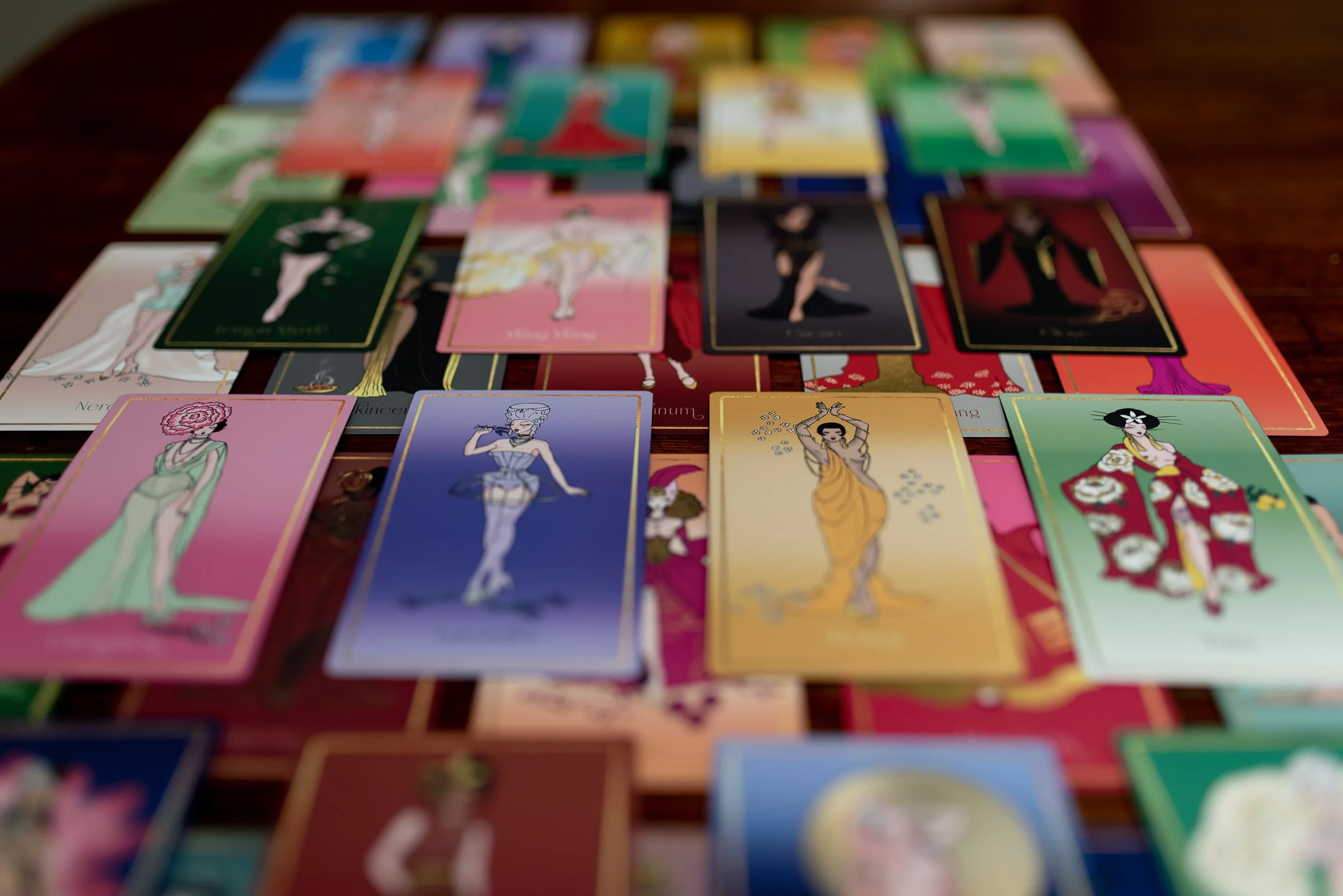 They are a high quality deck with a concept I've yet to see elsewhere. The art deco artwork is sensuous and evocative, and the attention to finer detail with the shimmering edges and vibrant colours keep your attention. They are a perfect size for shuffling, easy to hold, easy to shuffle, and they do not stick together.